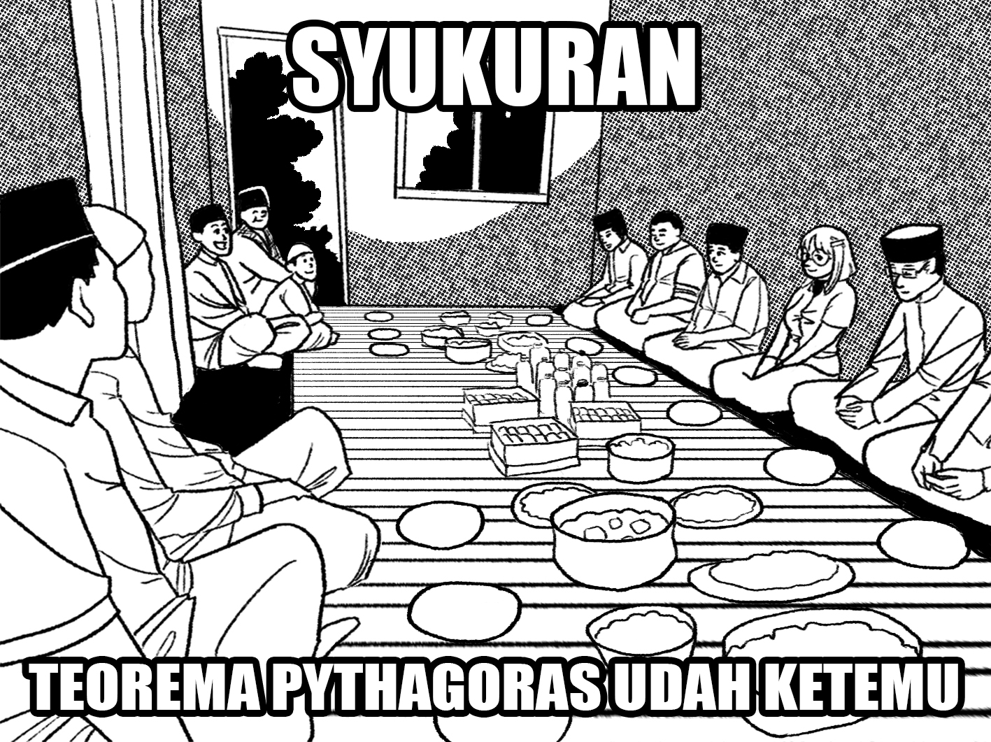 Pada awalnya, aku cukup polos tentang dunia anak SMA zaman sekarang. Hingga suatu ketika, aku berkenalan dengan seorang anak SMA zaman sekarang. Tinggi, badan atletis, teman di sana-sini, dan bahkan punya seorang pacar. Ya, gambaran sempurna dari karakter utama kartun Jepang bukan? Hingga saatnya aku belajar matematika bersamanya. Ketika kami belajar materi geometri, DIA LUPA TEOREMA PYTHAGORAS!! Bayangkan, kamu adalah seorang MC anime, dan ketika mengerjakan matematika, kamu lupa atau bahkan tidak tahu teorema Pythagoras, teorema sederhana yang menjadi fondasi geometri?! Aku jamin kamu akan menjadi no rizz aura -1000 dalam kedipan mata. Bahkan, kalau aku penulis ceritanya sih, aku akan segera mencabut titel ‘MC anime’ mu itu. Jadi, sebelum kalian pergi ke dunia lain dan menjadi MC anime, mari kita ulas teorema Pythagoras bersama-sama!