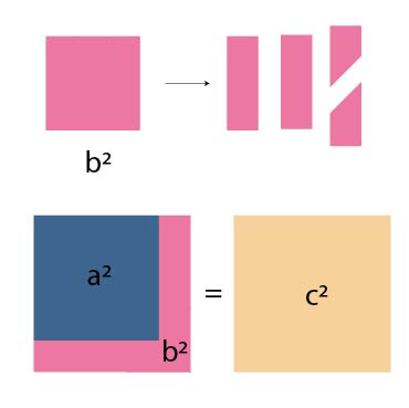 Pada Gambar 6, persegi $(b^2)$ dipotong-potong sebagaimana digambarkan, setelahnya, potongan-potongan itu diputar dan dibalik sehingga dapat membentuk persegi yang lebih besar bersama dengan